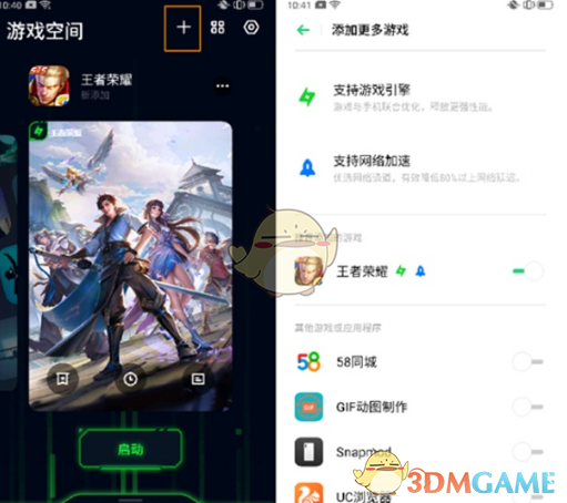 1、首先打開oppo手機,進入游戲空間界面,然后點擊右上角的“+”按鈕,將你想玩的游戲添加到游戲空間中。