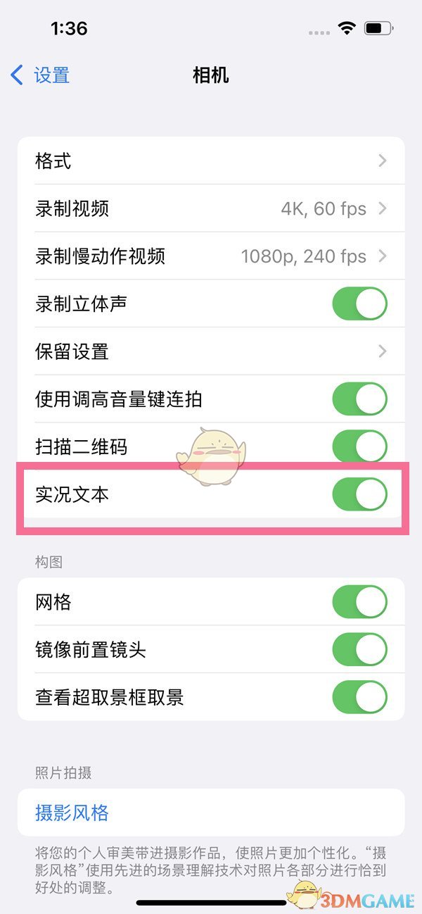 2、在相機設(shè)置頁面,開啟【實況文本】選項旁邊的開關(guān)。
