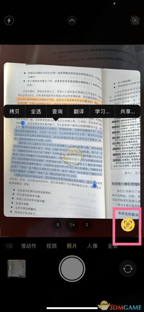 3、啟用后,在相片中點擊右下角的文本圖標(biāo),選擇圖片中的文字即可進行復(fù)制與提取。