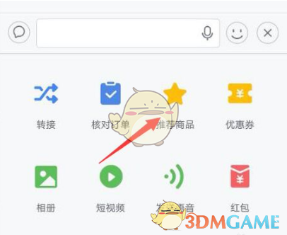 3、此時(shí),你將看到多個(gè)功能選項(xiàng),包括轉(zhuǎn)接、紅包等。在這些選項(xiàng)中,找到并點(diǎn)擊“推薦商品”一項(xiàng),進(jìn)入商品推薦界面。