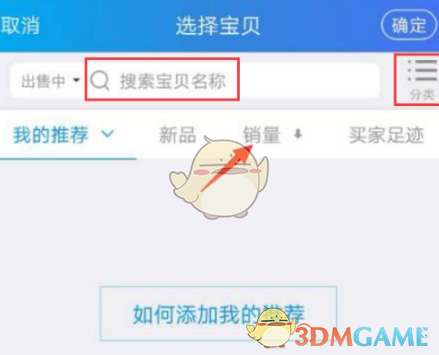 4、接著,你可以在商品推薦頁(yè)面選擇要發(fā)送的商品。如果當(dāng)前頁(yè)面沒(méi)有顯示你的商品,可以通過(guò)頂部的搜索框輸入商品名稱(chēng),或者直接點(diǎn)擊分類(lèi)查看。還可以點(diǎn)擊箭頭圖標(biāo),按銷(xiāo)量進(jìn)行排序。