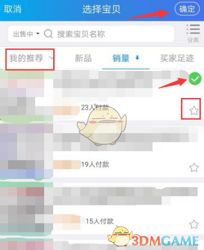 5、在商品列表中,你可以選擇按銷(xiāo)量排列商品。點(diǎn)擊頁(yè)面上的五角星按鈕,可以將商品加入推薦列表。選中之后,點(diǎn)擊“確定”按鈕,商品鏈接就可以發(fā)送給買(mǎi)家了。