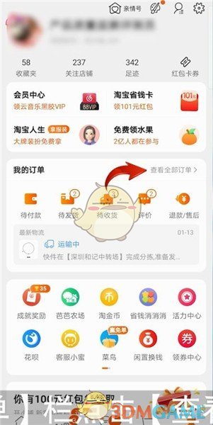 1、首先,打開【淘寶】App,點(diǎn)擊右下角的【我的淘寶】按鈕,進(jìn)入后選擇【我的訂單】欄目,然后點(diǎn)擊【查看全部訂單】。