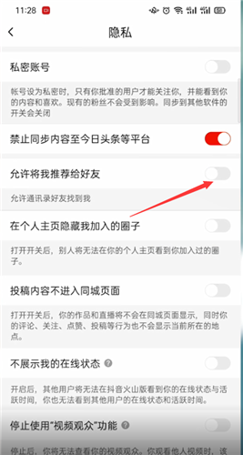 4. 在隱私頁面,找到“允許將我推薦給好友”的選項,點擊右側的滑塊,將其從紅色滑動至灰色狀態(tài),表示不再允許抖音火山版將你的信息推薦給通訊錄中的好友,且他們將無法找到你。
