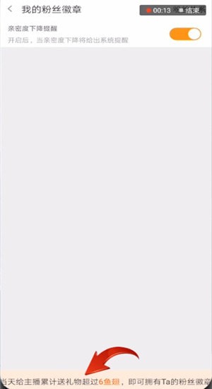 3、接下來,你會看到提示:“當(dāng)天給主播累計(jì)送出禮物超過6魚翅,就能獲得Ta的粉絲徽章”。