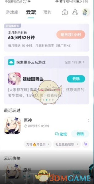2、進(jìn)入“云玩”板塊后,點(diǎn)擊簽到按鈕,就可以額外獲得一小時(shí)的游戲時(shí)長。