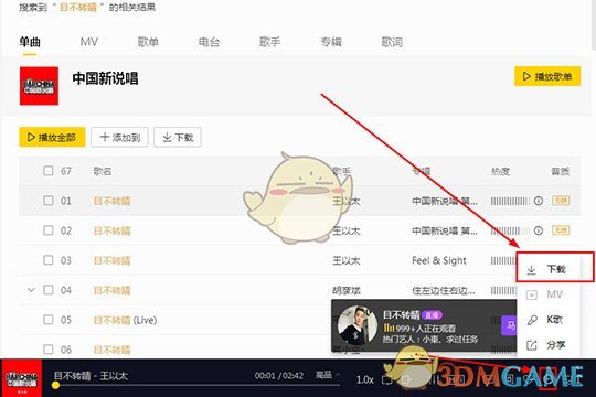 1、首先啟動酷我音樂電腦版,在搜索框中輸入你想下載的歌曲名稱,找到目標歌曲后點擊它,然后點擊右側(cè)的下載按鈕(見下圖中的紅色箭頭位置)。