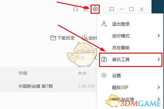 5、接著返回到酷我音樂主界面,點擊右上角的齒輪圖標,進入設(shè)置界面,然后選擇【設(shè)置】下的【音樂工具】選項。