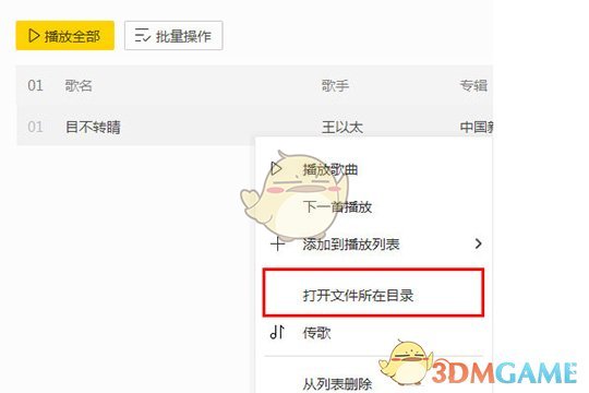 4、進入【下載情況】界面后,可以看到所有下載的歌曲。選擇剛下載的歌曲,右鍵點擊它并選擇【打開文件所在目錄】。