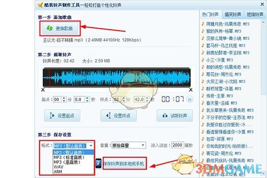 6、按照下圖中的步驟操作:選中你想要轉(zhuǎn)換的歌曲,裁剪所需的部分,選擇輸出格式為【MP3】,最后點擊【保存到本地】按鈕完成轉(zhuǎn)換。