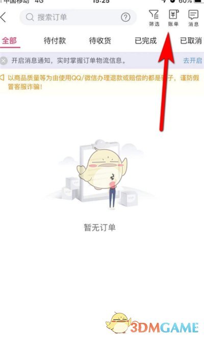 3、在全部訂單頁面的頂部,找到并點(diǎn)擊【賬單】選項(xiàng)。