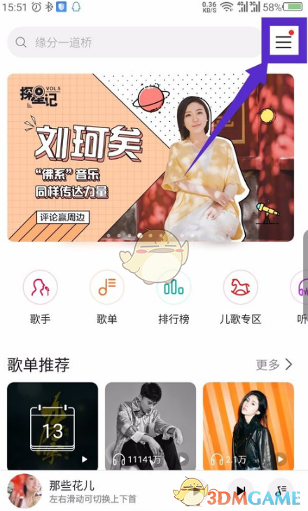 1、首先打開華為音樂應用,點擊界面右上角的三條橫線圖標。如圖所示。