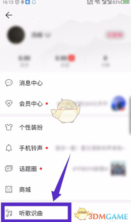 2、在下拉菜單中找到“聽歌識曲”選項,點擊進入。如圖所示。