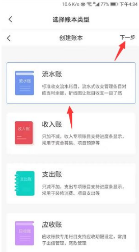 4、在選擇賬本類型頁面,勾選合適的賬本,點擊右上角的“下一步”