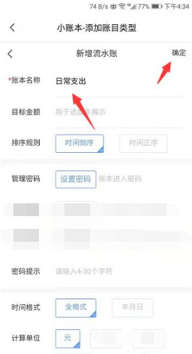 5、然后輸入賬本名稱和金額等信息,點擊右上角的“確定”