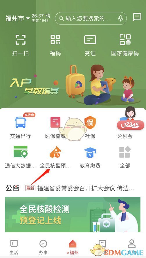 1、首先打開e福州app,在首頁(yè)找到并點(diǎn)擊“全民核酸預(yù)登記”。