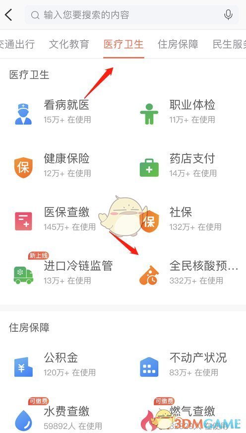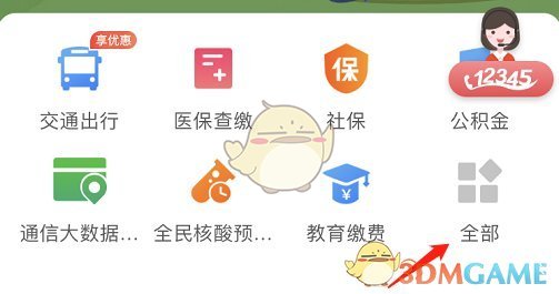 2、另外,您也可以點(diǎn)擊“全部”選項(xiàng),進(jìn)入“醫(yī)療衛(wèi)生”欄目,找到并選擇“全民核酸預(yù)登記”。