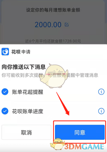 3、同意訂閱后,頁面會提示您,花唄將為您發(fā)送花超提醒和賬單進度通知,點擊同意即可。