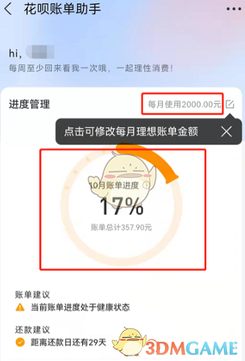 4、最后,您可以看到當前的花費進度百分比,點擊“進度管理”即可調(diào)整您的理想金額設(shè)置。