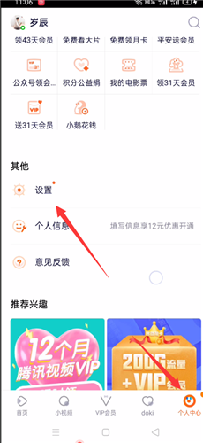 1、首先打開騰訊視頻,進入個人中心頁面,向下滑動頁面,找到并點擊“設置”選項。