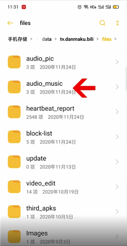 5、最后進(jìn)入audio-music文件夾,便可以看到在嗶哩嗶哩下載的音頻文件。