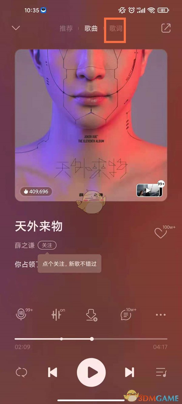 1、首先打開(kāi)QQ音樂(lè),在播放頁(yè)面中點(diǎn)擊“歌詞”按鈕。