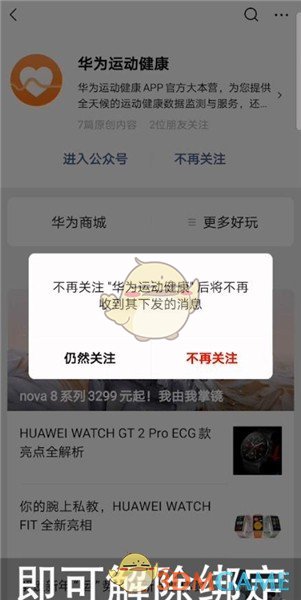 1、首先,打開【微信】應(yīng)用,搜索“華為運(yùn)動(dòng)健康”公眾號(hào),然后選擇取消關(guān)注,這樣就能解除綁定關(guān)系。