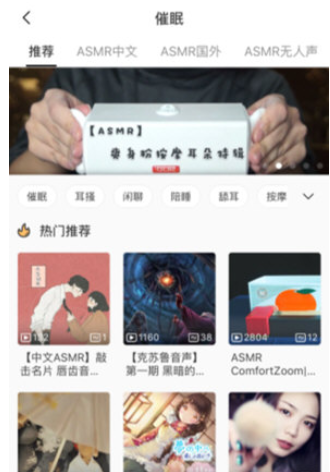 2、進(jìn)入“催眠”頁面后,你就可以瀏覽并選擇自己喜歡的ASMR內(nèi)容了。