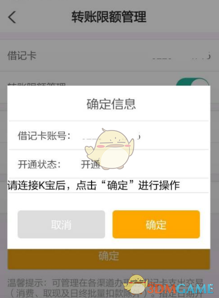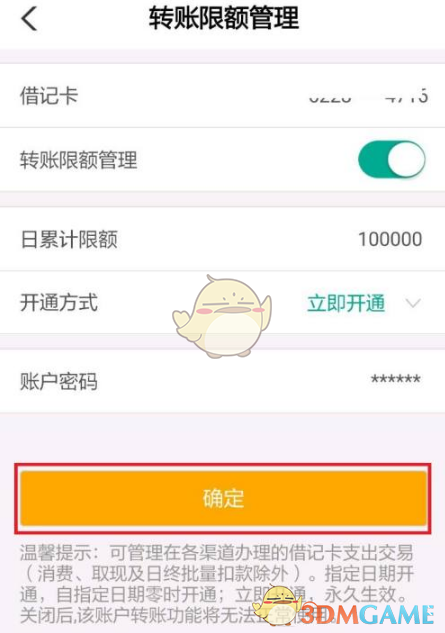 5、進(jìn)入轉(zhuǎn)賬限額管理設(shè)置頁面,設(shè)置所需的轉(zhuǎn)賬限額信息后,點(diǎn)擊【確定】,如下圖所示。