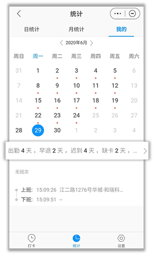 如果您想查看個人的考勤數(shù)據(jù),可以進入統(tǒng)計頁面。在這里,您可以查看到每天的打卡情況。點擊頁面中的出勤統(tǒng)計條幅,您就能看到本月的詳細考勤記錄,包括出勤天數(shù)、遲到、早退、缺卡以及曠工的天數(shù)。