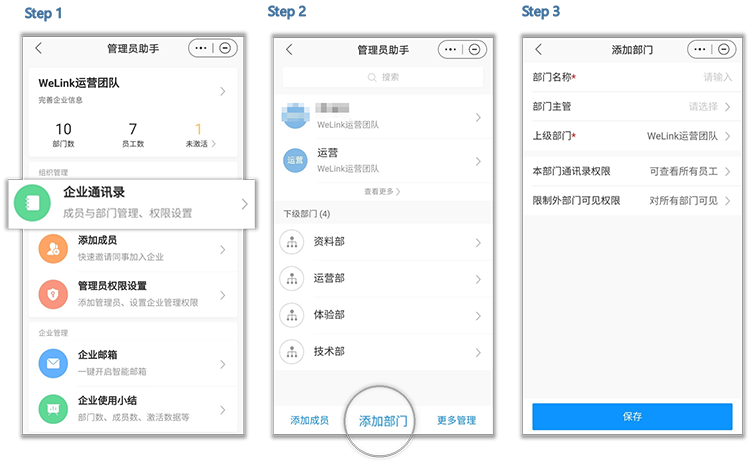 2、在管理員助手頁面,選擇“企業(yè)通訊錄”功能,點擊“添加部門”,然后輸入部門名稱及相關(guān)信息,并設(shè)置通訊錄權(quán)限。最后,點擊“保存”按鈕完成操作。