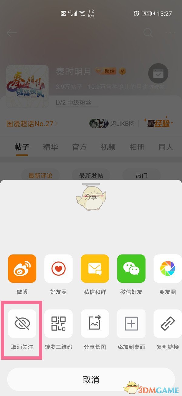 3、選擇需要取消關注的超話,點擊右上角的三點圖標,并選擇【取消關注】。