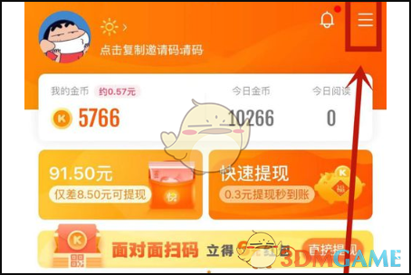 1、首先打開(kāi)快看點(diǎn)App,點(diǎn)擊底部菜單欄中的“任務(wù)”選項(xiàng),然后在任務(wù)頁(yè)面右上角找到并點(diǎn)擊三條橫線圖標(biāo)。
