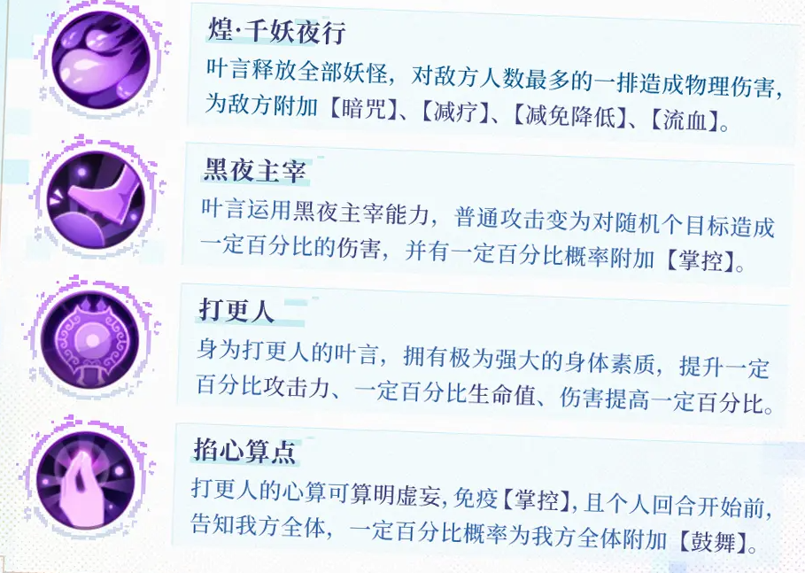葉言召喚所有妖怪,向敵方人數(shù)最多的排敵造成物理傷害,并為敵人附加【暗咒】、【減療】、【減免降低】和【流血】等效果。