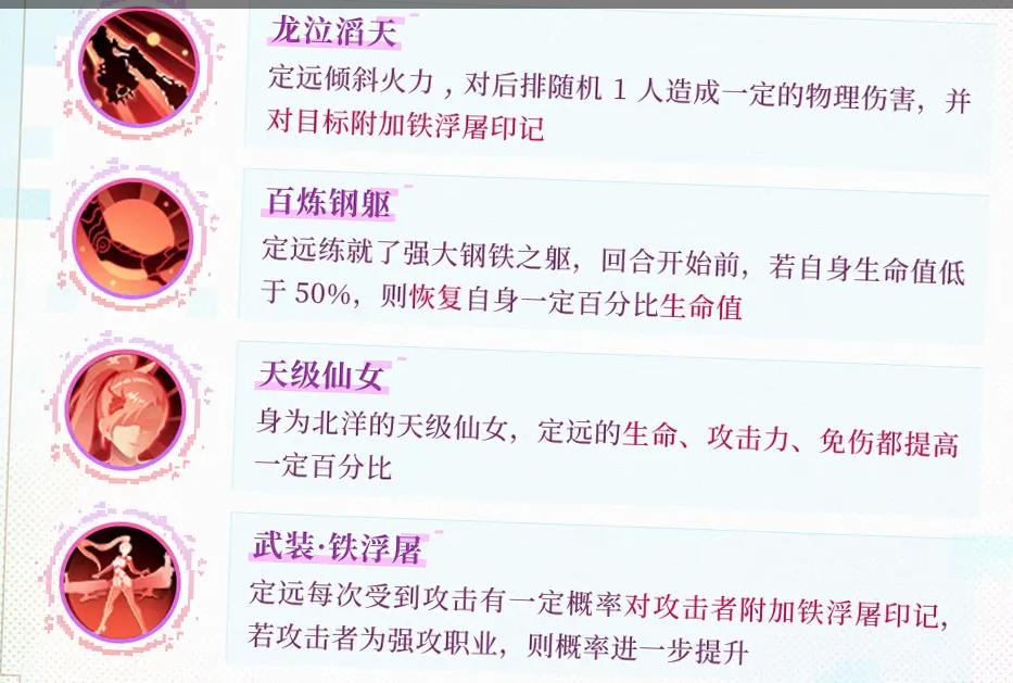 作為北洋的天級仙女,定遠的生命、攻擊力以及免傷效果都能得到顯著提升。