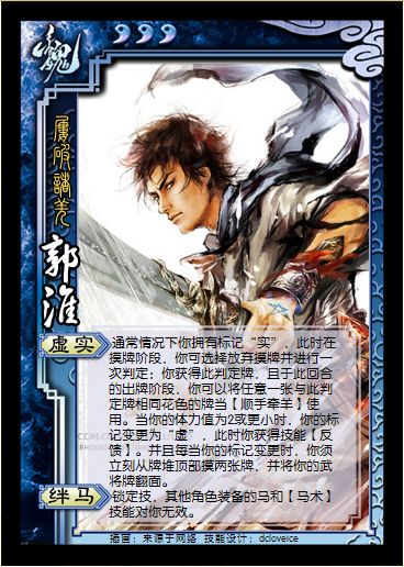 由于郭淮的玩法更多依賴回合內的策略,因此他對于有能力給予他支援的武將有著極高的期望。然而,三國殺中的‘伯樂’寥寥無幾,這也使得像郭淮這樣的角色常常難以發(fā)揮。