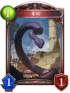 《影之詩》中的毒蛇是一張衍生物卡牌,初始狀態(tài)下其身材為1/1,沒有附加技能。然而,當美杜莎在場時,2張毒蛇卡可以合成成為梅杜希亞娜。若無特殊條件,它就是一張無甚用處的炮灰卡。