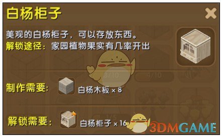 今天給大家介紹《迷你世界》中的白楊柜子,它是由白楊木制作而成的家具系列之一。這個(gè)柜子非常適合用來(lái)存放物品哦。如果你還不清楚如何合成白楊柜子,快來(lái)看看下面的圖鑒吧。