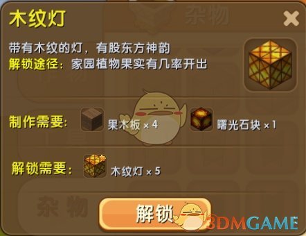 解鎖木紋燈所需條件:木紋燈碎片*5。木紋燈碎片可以通過家園植物的果實(shí)隨機(jī)獲得,或者你可以花費(fèi)450迷你豆進(jìn)行解鎖。