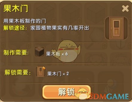 果木門的解鎖條件是:果木門碎片*2。果木門碎片有一定幾率從家園植物的果實中掉落。你還需要消耗180迷你豆來解鎖這款門。