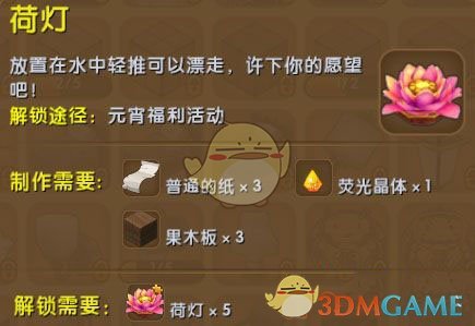 在生存模式下,制作荷燈需要:普通紙張*3、熒光晶體*1、果木板*3,合成后即可獲得荷燈。