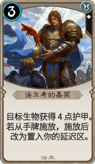目標(biāo)生物獲得4點(diǎn)護(hù)甲。如果這張卡從手牌施放,施放后它將轉(zhuǎn)入你的延遲區(qū)。 |
