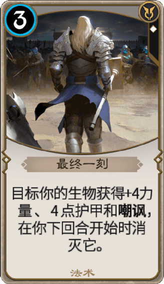 目標(biāo)生物獲得+4力量、4點(diǎn)護(hù)甲和嘲諷效果,但在你下個(gè)回合開始時(shí)將其消滅。 |
