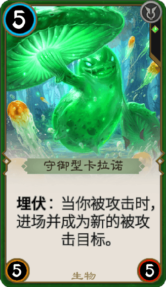 守御型卡拉諾的獨特之處在于其驚人的再生能力,能夠讓身上的孢子迅速復生,雖然其威脅度相對較低,但這一能力依然使其非常耐久。這是《秘境對決》中的一張綠色生物卡。