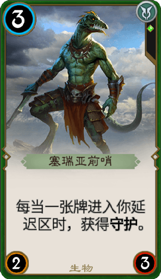 塞瑞亞前哨在戰(zhàn)術(shù)上的作用極為關(guān)鍵,它們不僅能夠有效避免與半人馬的直接沖突,還能在危險來臨之前做好充分的準備。畢竟在正面交鋒中,蜥蜴人無法與半人馬抗衡。這張卡牌是《秘境對決》中的一張綠色生物卡。