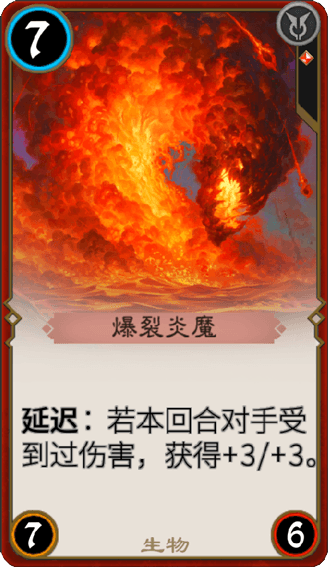在沙漠中,通常會有許多微小的火焰球出現,隨著時間推移,它們會逐漸熄滅。然而,極少數的火焰會一直燃燒,并最終聚集成一個巨大的火焰元素——爆裂炎魔。如果不及時躲避,那就只能眼睜睜地看著它吞噬一切。這是《秘境對決》中的一張紅色生物卡。