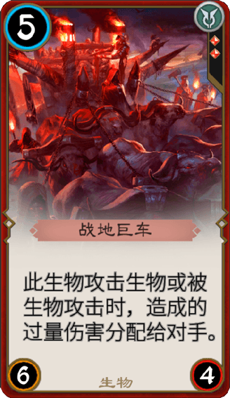 戰(zhàn)地巨車是一種用來慶祝伯棱克利人在戰(zhàn)斗中榮耀的象征,車上載滿了被俘的敵軍,隨著這些囚徒的悲鳴聲,城中的人們情緒更加高漲。這正是對敵人的警告。它是《秘境對決》中的一張紅色生物卡牌。