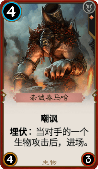 嘲諷 埋伏:當(dāng)敵方生物攻擊后,這張卡進(jìn)入場(chǎng)地。 |