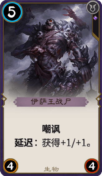 伊薩王戰(zhàn)尸是由伊薩王利用黑暗法術(shù)創(chuàng)造的怪物,它們的軀體由玻璃和魔法所控制,沒有思維,僅有冷酷的殺戮本能。至今沒有人能夠真正找到擊敗它們的方法。這張卡片是《秘境對決》中的一張黑色生物卡。