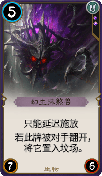 幻生抹煞獸是一種存在于亞夏古樹中的神秘生物,它本曾沉睡于古老的樹木之中,然而如今借助巫女的強大法力,它重獲新生,再次在這個世界上肆意橫行。隨著它的覺醒,更多古老的咒術(shù)也將陸續(xù)展現(xiàn)。這張卡片出現(xiàn)在《秘境對決》中的黑色生物卡系列。